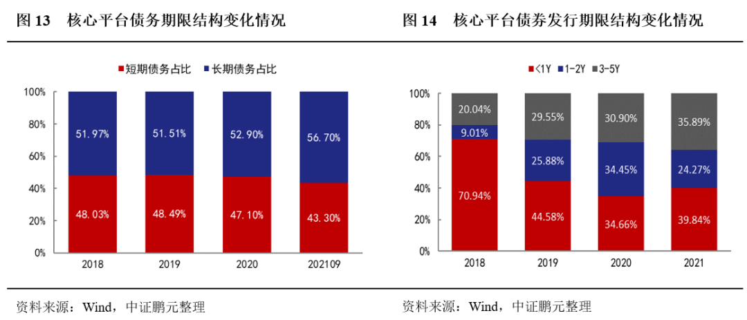 鎮(zhèn)江市核心平臺(tái)債券發(fā)行期限結(jié)構(gòu)近年整體改善明顯。從平臺(tái)債務(wù)期限結(jié)構(gòu)來看,2018年-2020年,鎮(zhèn)江五大市級(jí)平臺(tái)短期債務(wù)占比小幅波動(dòng),2021年1-9月,核心平臺(tái)短期債務(wù)占比顯著下降,債務(wù)期限結(jié)構(gòu)有所改善。從債券發(fā)行視角來看,核心平臺(tái)中長期債券發(fā)行比例呈現(xiàn)持續(xù)增長態(tài)勢,債券發(fā)行期限結(jié)構(gòu)改善明顯。