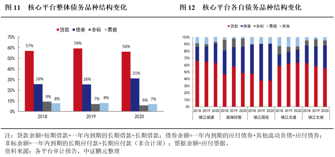 銀行貸款支持缺乏持續(xù)性和普遍性,債券發(fā)行利率下行帶動(dòng)直融占比普遍提升,對(duì)非標(biāo)形成一定置換,整體債務(wù)品種結(jié)構(gòu)有所改善。整體來看,銀行貸款作為鎮(zhèn)江五大平臺(tái)的核心融資渠道,近年貸款總規(guī)模占有息債務(wù)的比重僅在2019年有所增加,隨后又明顯回落,其中,鎮(zhèn)江城建、鎮(zhèn)江國投和鎮(zhèn)江文旅銀行貸款比例逐漸壓縮,而瀚瑞控股和鎮(zhèn)江交通銀行貸款占總債務(wù)的比重則總體呈上升的趨勢。直融和非標(biāo)方面,由于 2019年-2020年正處于債券發(fā)行利率下行的窗口期,在此期間五大平臺(tái)均不約而同地選擇擴(kuò)大債券發(fā)行規(guī)模,直融占比有所提升;與此同時(shí),除了鎮(zhèn)江文旅以外,近三年其他四家平臺(tái)非標(biāo)融資比例均持續(xù)壓降,其中鎮(zhèn)江國投非標(biāo)債務(wù)規(guī)模很小,瀚瑞控股非標(biāo)債務(wù)占比超過10%,鎮(zhèn)江交通非標(biāo)壓降效果最為顯著。