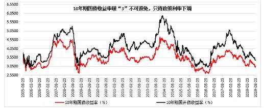 雖然10年期國債收益率在近期內盤中多次破“3”,但收盤價卻始終在3%以上。2019年8月13日,10年期國債收益率自7月29日連續下行18個BP至3.0041%的水平,不到半個月下行了近20個BP,這也是最接近3%的一次。