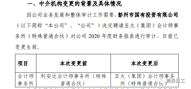 3、彭州市國有投資有限公司2021年4月30日公告,決定聘請亞太(集團(tuán))會計師事 務(wù)所(特殊普通合伙)對公司 2020 年度財務(wù)報表進(jìn)行審計。