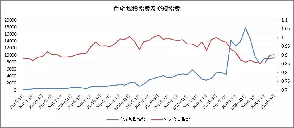 趨勢分析:住宅類房產的成交量自2015年1月以來至2018年8月呈指數型增長,此后成交量在高位震蕩了4個月后開始逐漸下滑;2015年1月至今,住宅類房產的變現能力呈現出先增后降的趨勢,2018年5月以后開始逐漸下滑,2019年5月的月度平均變現折扣率僅為90.19%。