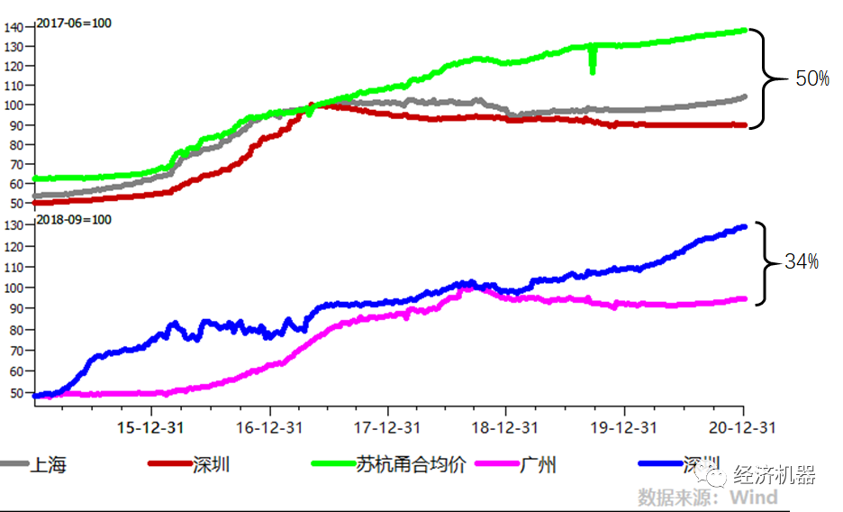 過去一年,盡管出現疫情,但北上廣成交量顯著放大(圖2)。量在價先,如果這種趨勢在今年上半年得以延續,則價格很可能出現一波上行。實際上,2020年廣州二手房已經出現了較為明顯的上漲勢頭。上海浦東學區房去年下半年以來,出現了較大幅度的上漲。北京相對滯后,但海淀部分學區屬性的小區房價也出現明顯上漲。