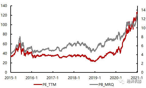 整體來講,過去數年的“核心資產”牛市分為幾個階段:戴維斯雙升(2014-2017年)-調整消化估值階段(2018年)-估值回升階段(2019年)-抱團與泡沫階段(2020年)。目前在盈利能力沒有出現明顯改善情況下,很多核心資產PE估值超過100倍,PE或PB的歷史分位數在95%以上,甚至處于100%水平上,泡沫化跡象明顯(圖3)。
