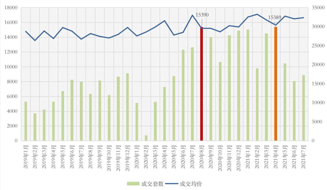 圖:2019年1月-2021年7月杭州二手住宅成交量價走勢(單位:套,元/平方米)