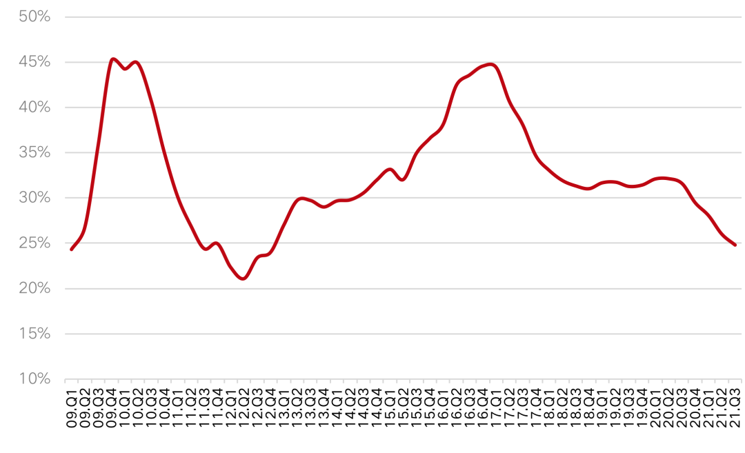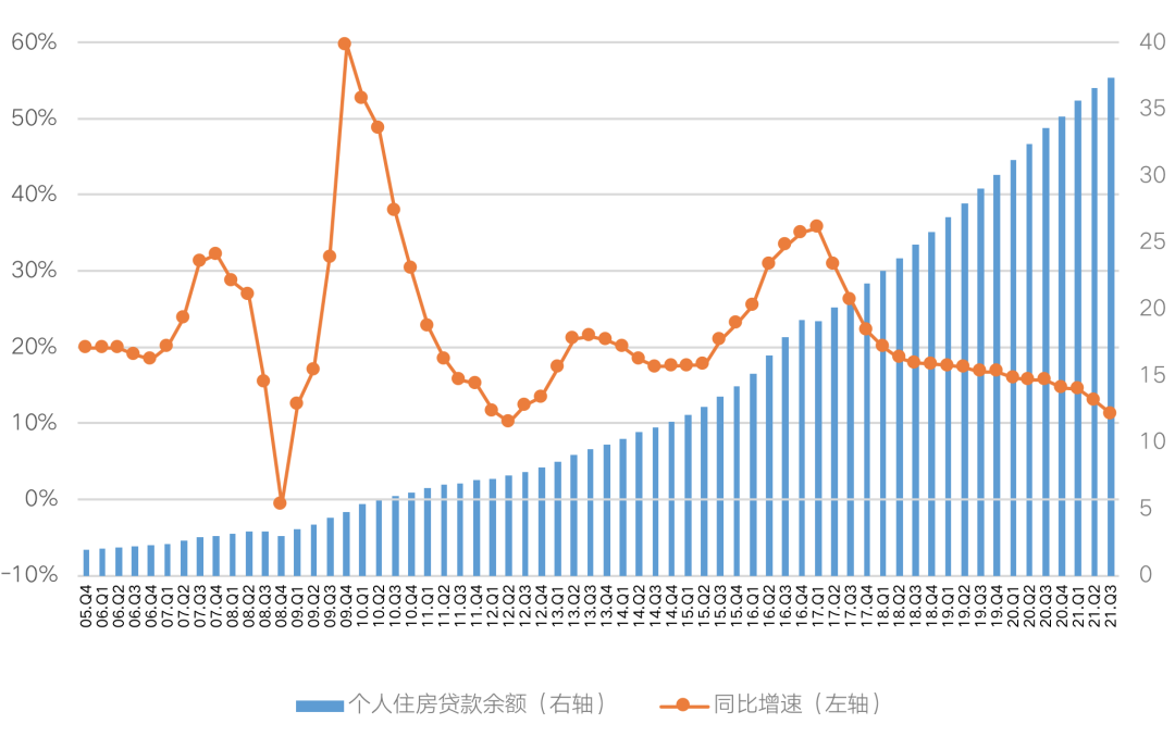 這一輪下跌自2017年二季度開始,保持回落態勢至今,2018年二季度以來回落速度有所趨緩。2020年四季度,部分銀行個人房貸額度緊張,放貸速度變慢,個人住房貸款余額同比增速回落的幅度略有擴大,2021年一季度以來個人住房貸款余額同比增速回落幅度不斷擴大,三季度增速回落至11.3%。