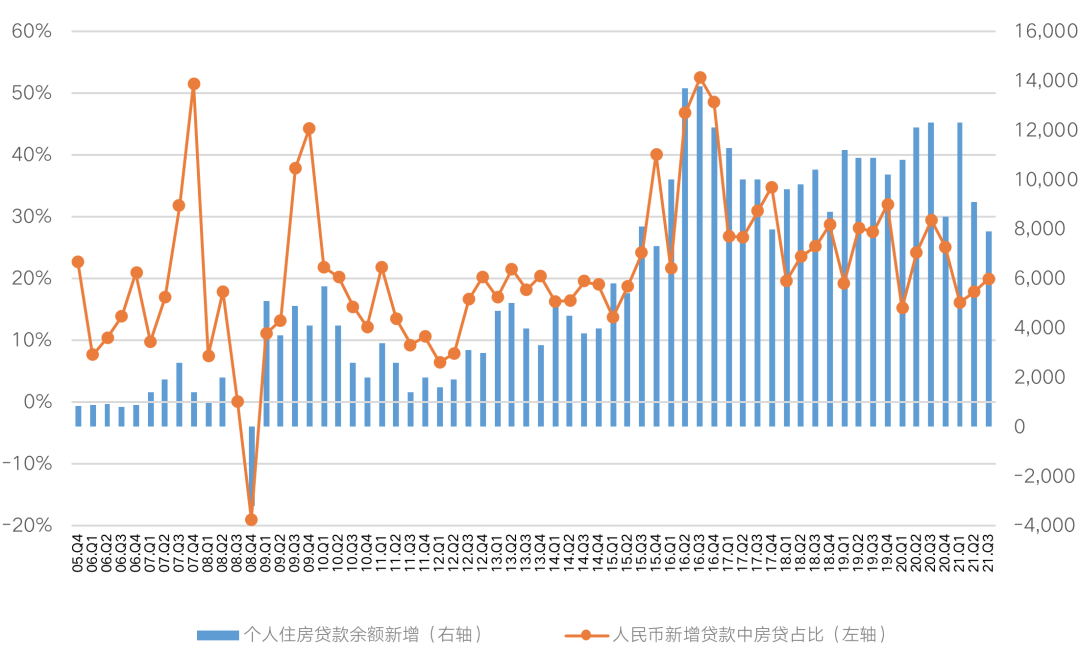 按照房貸兩集中政策,對各類銀行業金融機構的房地產貸款和個人住房貸款占比設置了上限,進行分檔管理。至2021年三季度,個人住房貸款新增額同環比下降,個人住房按揭貸款新增額占新增境內貸款比例為20%,創2014年以來同期新低。
