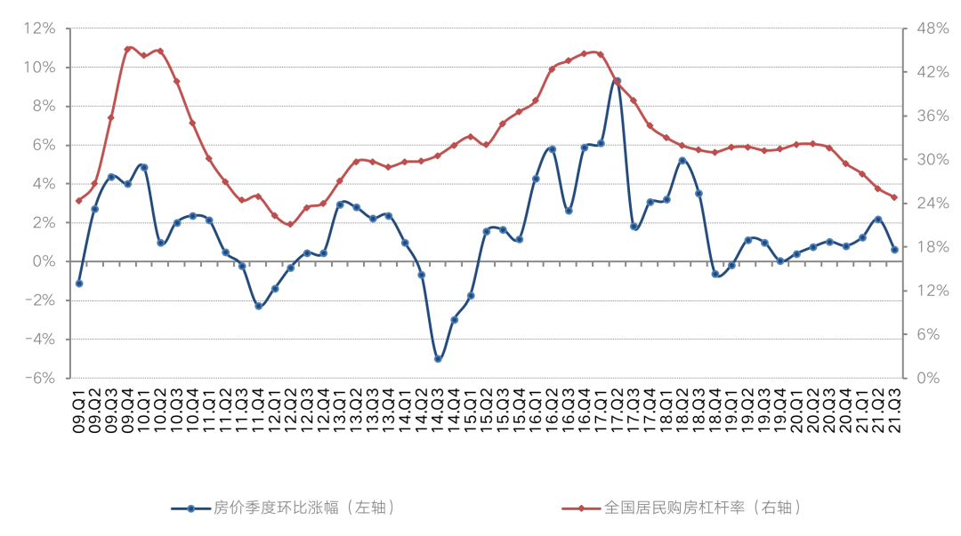 圖:全國居民購房杠桿率與百城房價指數環比漲幅