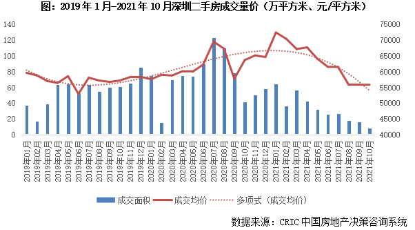 早在2月8日,深圳便出臺二手房成交參考價。受此影響,深圳二手房市場愈加慘淡,成交連續7個月下滑。10月,深圳二手房成交面積進一步回落至8萬平方米,創歷史新低,環比再降50%,同比跌幅擴至81%。成交均價持續下滑至55805元/平方米,環比基本持平,同比下跌12%。1-10月,深圳二手房累計成交324萬平方米,同比下降57%。