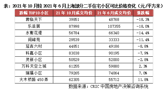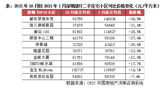 而以部分二手住宅小區為例,都市翠海華苑小區成交均價由2021年1月146036元/平方米大幅下滑至2021年10月92755元/平方米,累計跌幅高達36.5%。隆盛花園成交均價則由2021年1月39761元/平方米持續下行至2021年10月30371元/平方米,累計下跌23.6%。