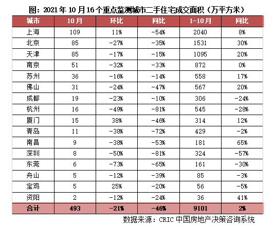 10月,二手房市場異常低迷,16個重點監測城市成交面積493萬平方米,環比再降21%,同比跌幅擴至46%。其中,8成以上城市成交環比繼續下降,深圳、東莞更是創年內新低,環比皆腰斬。各城市成交同比皆降,近4成城市同比腰斬,深圳、杭州同比跌幅更是超80%。