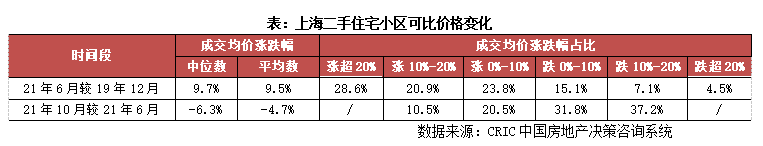 而在指導價出臺后,上海二手房價格則由漲轉跌。剔除零星成交的二手住宅小區,上海2021年10月二手住宅小區售價較2021年6月溫和下跌,可比價格跌幅中位數、平均數分別為-6.3%和-4.7%。其中,可比價格跌幅在10%-20%的二手房小區占比多達37.2%,其次為可比價格跌幅在0%-10%的二手房小區,占比約31.8%,另有31%的二手房小區可比價格仍有所上漲。