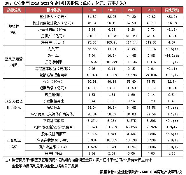 【結轉不暢致營收下降,2021年凈利率僅0.8%】2021年眾安集團實現營業收入49.7億元,其中地產銷售收入由于結轉時間的影響為42.8億元,同比下降36.6%,是企業營收下降的主要因素。酒店經營、商業租賃及物業管理等多元化業務收入約6.9億元,整體與2020年持平。關于地產結轉問題,業績會上管理層預期2022年會有修復,全年結轉收入會在100億以上。2021年眾安集團實現整體毛利潤約14.8億元,整體毛利率約為29.7%,相較2020年略降0.5個百分點。根據管理層透露,未來企業毛利率將會持續維持在30%的水平。全年凈利潤僅0.39億元,凈利率0.8%。