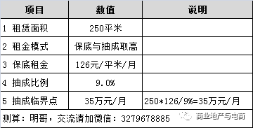 該商戶保底租金126元/月/平米,抽成比例9%,則抽成臨界點為: