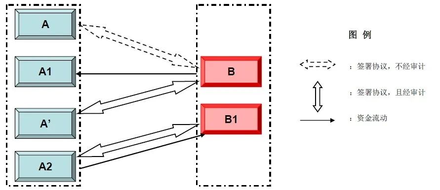 其中B為收購(gòu)方,A為轉(zhuǎn)讓方,A1受A的實(shí)際控制但沒(méi)有直接的股權(quán)關(guān)系,A’為A的合作伙伴