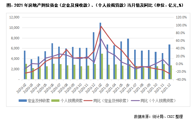 在定金及預(yù)收款方面,由于12月全國商品房共計銷售21302萬平方米和20263億元,同比則分別下降15.6%和17.8%,表現(xiàn)低于歷史同期。12月定金及預(yù)收款為6790億元,同比下降25.9%,降幅較11月的16.9%進(jìn)一步擴大,達(dá)到近五年新低。但從總體來看,2021年房地產(chǎn)開發(fā)資金來源(定金及預(yù)收款)73946億元,同比增長11.1%,較2019年增長20.5%。