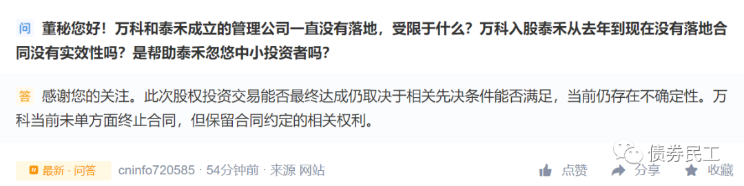 2、2021年6月1日,萬科董秘在深交所互動平臺中明確表示,萬科和泰禾的合作事宜最終能否達成取決于相關先決條件能否滿足,目前仍然存在不確定性。在2020年7月31日,深陷違約泥潭的泰禾集團公布了重磅消息:萬科正式入股泰禾集團,將持有泰禾集團19.9%股份。當時這筆交易存在明確的先決條件泰禾制定債務重組方案并與債權人達成一致、萬科對泰禾完成盡調且就發現問題的解決方案及擬議交易的方案達成一致。