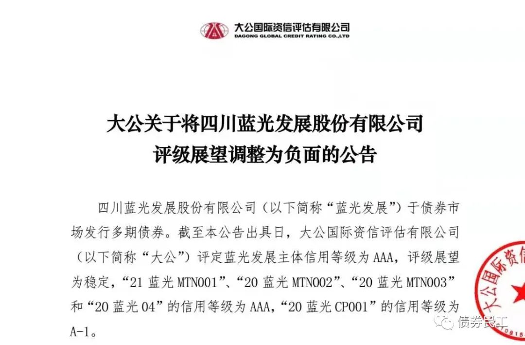 1、2021年6月1日,四川藍光發展股份有限公司(以下簡稱“藍光發展”)發布公告,大公國際決定維持藍光發展主體信用等級AAA,評級展望調整為負面。評級展望調整為負面的主要原因是部分項目去化壓力較大、新增土地儲備規模減少、盈利能力有所下滑、短期償債壓力較大等。而在大公國際調整藍光發展的評級展望之前,標普于2021年5月31日將藍光發展的長期發行人信用評級從“B+”下調至“B-”,并置于負面信用觀察名單。