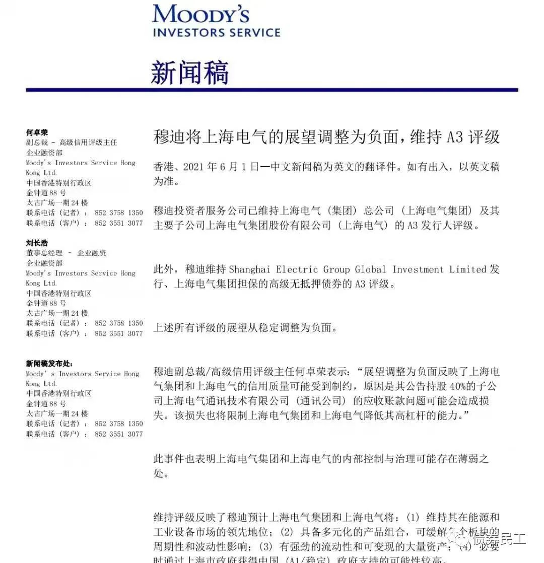 3、2021年6月1日,穆迪將上海電氣(集團)總公司及其核心子公司上海電氣集團股份有限公司的評級的展望從“穩定”調整為“負面”。在上海電氣集團股份有限公司5月31日的公告中,公司持股40%的控股子公司上海電氣通訊技術有限公司應收賬款普遍逾期,最終可能對公司造成83億元的損失。此次應收賬款逾期事件在市場上引起了較大的關注,后續進展和信息披露尤其引人注意。