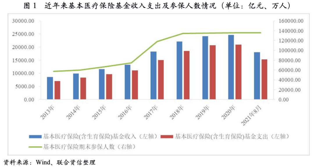 從醫藥行業下游支付能力來看,醫保基金作為最重要的支付方,其支付額約占整體醫療衛生總費用的約40%,醫?;鸬闹Ц赌芰χ苯記Q定了醫藥行業的回款情況。根據國家醫保局數據顯示,2020年,全國基本醫保基金(含生育保險)總收入為2.46萬億元,同比增長0.08%;全國基本醫?;穑êkU)總支出為2.09萬億元,同比變化不大,年末醫?;鹄塾嫿Y余3.14萬億元。2021年1-10月,全國基本醫?;穑êkU)總收入為2.46萬億元,全國基本醫保基金(含生育保險)總支出為1.90萬億元。