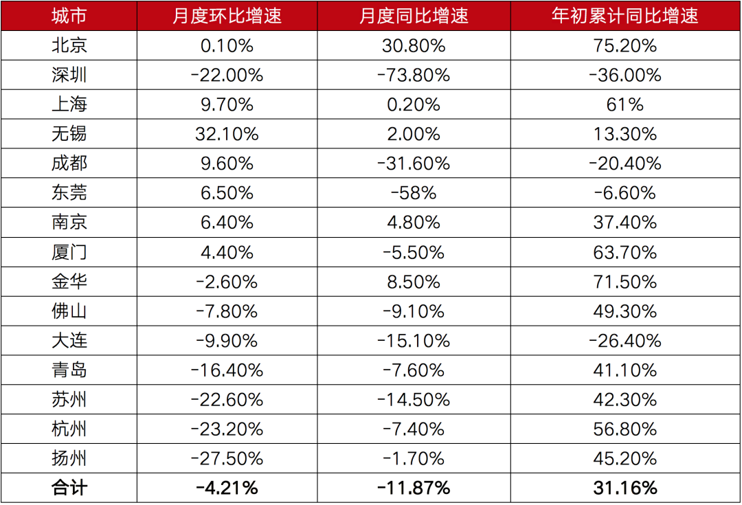 單城市來看,揚州二手住宅成交環比降幅最大,6月成交量環比減少27.5%;同比來看,深圳降幅最大,同比下降73.8%。從累計成交情況來看,北京6月二手住宅成交量同比增加75.2%;而深圳二手住宅成交量上半年累計減少36%。