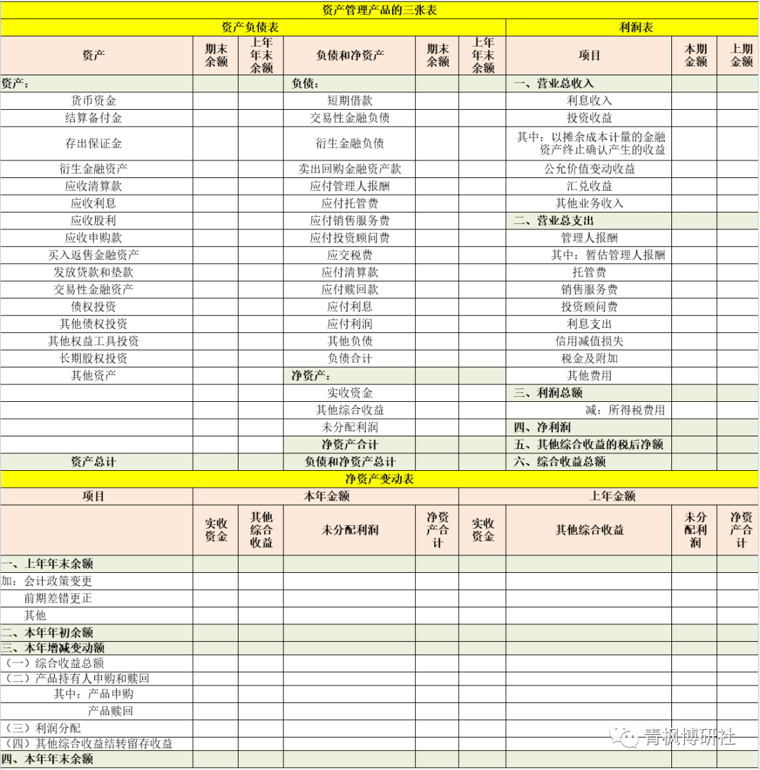(4)豁免現(xiàn)金流量表編制要求,也即資管產(chǎn)品僅需編制《資產(chǎn)負債表》、《利潤表》以及《凈資產(chǎn)變動表》三類。