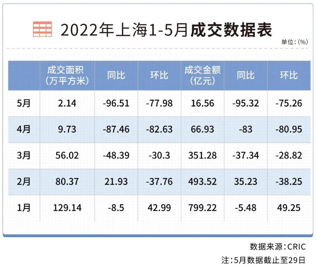 從房地產(chǎn)市場(chǎng)來看,4月新房供應(yīng)環(huán)比減少97%,同比減少97%,成交面積環(huán)比減少83%,同比減少87%,5月成交陷入低谷,截止至2022年5月29日,5月新房成交2.14萬平方米同比下降96.51%,在4月跌8成的基礎(chǔ)上進(jìn)一步環(huán)比下降77.98%,受其影響,整個(gè)長(zhǎng)三角地區(qū)成交同樣慘淡。