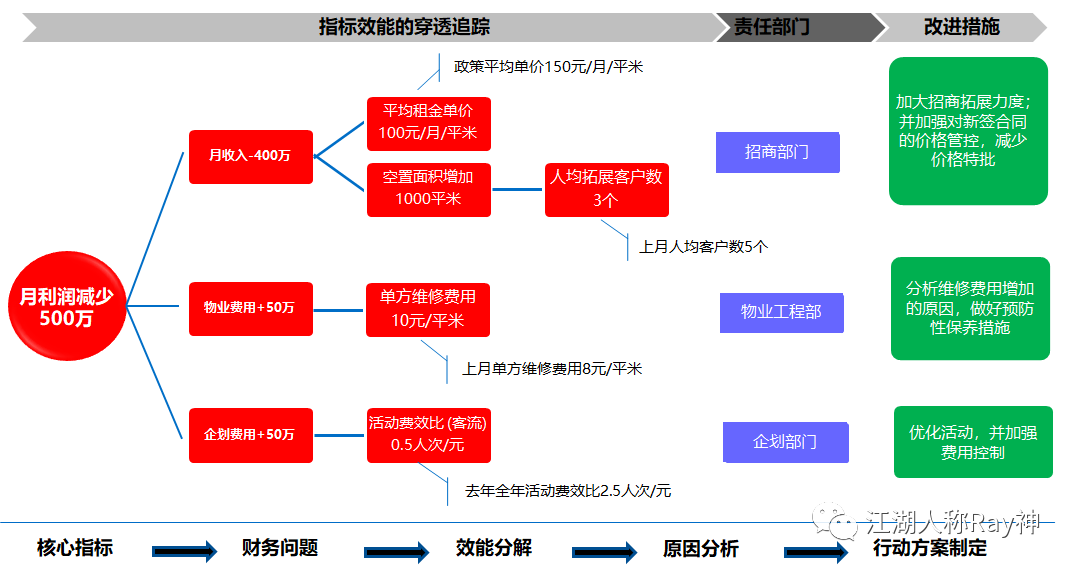 對(duì)于企業(yè)管理者而言,效能分析最直觀的體現(xiàn)就是財(cái)務(wù)指標(biāo)。整理財(cái)務(wù)指標(biāo)的常用方法可以參考杜邦分析等方法。指標(biāo)配合到前面說(shuō)的衡量依據(jù),就可以用來(lái)評(píng)估效能了。比如:從組織效能出發(fā)的人均利潤(rùn)、人均收入等;又比如:從空間效能出發(fā)的平米租金、單方成本、單方費(fèi)用等;再比如:從資金效能出發(fā)的自有資金回報(bào)率(ROIC)、經(jīng)營(yíng)利潤(rùn)率等。