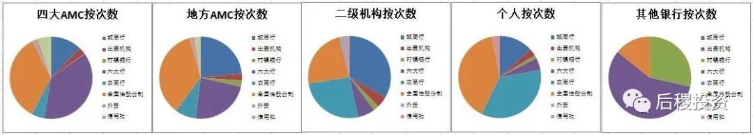按戶數看,持牌AMC從各類型的銀行的受讓比例與受讓次數呈正比,城商行、全國性股份制銀行和國有六大行占了戶數的絕大多數,而二級機構和自然人則從信用社受讓的戶數比例較高,這也是符合市場特征的。