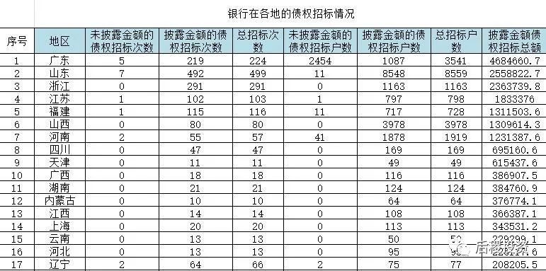銀行招標次數前五的省份是山東、浙江、廣東、福建和江蘇,戶數前五的省份是山東、山西、廣東、河南和浙江,而披露的金額前五的省份是廣東、山東、浙江、江蘇和福建,山西和河南排第六和第七。總體來說除傳統成交活躍大省外,河南和山西等中部地區省份的銀行的債權招標力度也較大。
