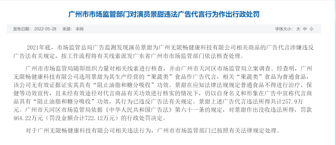 根據(jù)廣州市市場監(jiān)督管理局官網(wǎng),2022年5月28日,廣州無限暢健康科技有限公司選用景甜為其生產(chǎn)經(jīng)營的“果蔬類”食品作廣告代言,相關(guān)“果蔬類”食品為普通食品,該公司無有效證據(jù)證實其具有“阻止油脂和糖分吸收”功效。景甜在應(yīng)知法律法規(guī)規(guī)定普通食品不得進(jìn)行治療、保健等功效宣傳,且未經(jīng)有效途徑對代言商品有關(guān)功效進(jìn)行核實的情況下,仍以自身名義和形象在廣告中宣稱代言商品具有“阻止油脂和糖分吸收”功效,其行為已違反廣告法有關(guān)規(guī)定。景甜上述廣告代言違法所得共計257.9萬元。廣州市天河區(qū)市場監(jiān)管局依據(jù)《中華人民共和國廣告法》第六十一條的規(guī)定,對景甜作出沒收違法所得,罰款464.22萬元(罰沒金額合計722.12萬元)的行政處罰決定。