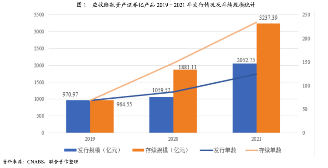 從發(fā)行情況來看,2019-2021年,應收賬款資產(chǎn)證券化產(chǎn)品在交易所市場和銀行間市場共發(fā)行280單,發(fā)行規(guī)模4083.24億元,近三年來,應收賬款資產(chǎn)證券化產(chǎn)品發(fā)行規(guī)模逐年遞增;截至2021年末,處于存續(xù)期的應收賬款資產(chǎn)證券化產(chǎn)品合計234單,存續(xù)規(guī)模合計3237.39億元。近三年來發(fā)行情況如下圖所示。