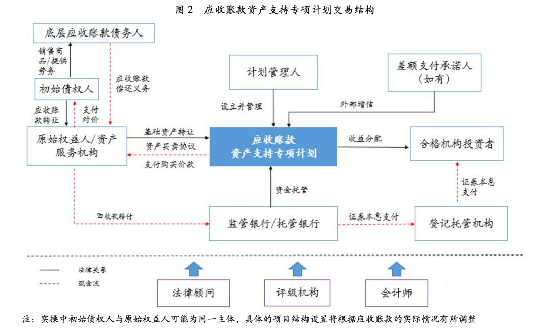應收賬款資產(chǎn)證券化,是由企業(yè)作為發(fā)起人,將其所擁有的符合標準的應收賬款組建基礎資產(chǎn)池出售/轉讓給資產(chǎn)支持專項計劃/資產(chǎn)支持票據(jù)等特殊目的載體(SPV),由計劃管理人/受托人發(fā)行設立的資產(chǎn)證券化產(chǎn)品。以在交易所發(fā)行的資產(chǎn)專項計劃產(chǎn)品為例,交易結構如下圖所示。