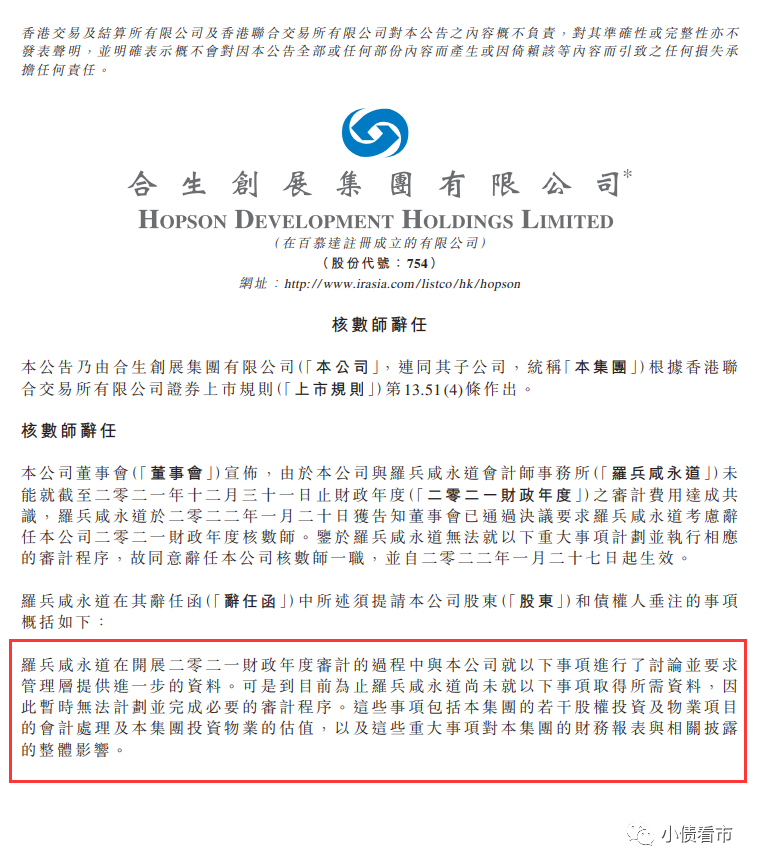 值得注意的是,除了提到與會(huì)計(jì)師事務(wù)所在費(fèi)用上存在分歧之外,合生創(chuàng)展還稱(chēng)未按照前任審計(jì)師要求提供信息。