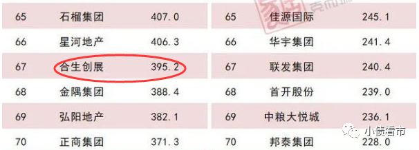 據(jù)克而瑞數(shù)據(jù),合生創(chuàng)展以395.2億操盤(pán)金額位居房企第67位,體量上看屬于中小型房企。