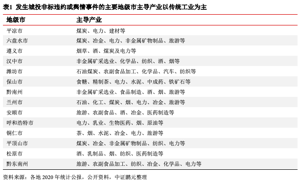 從經濟發展水平來看,除發生輿情事件的濰坊市外,其余發生非標違約或輿情事件的主要地級市2020年GDP全部在4,000億元以下,且同期地區人均GDP基本低于全國人均GDP,地區經濟發展水平較低。從產業結構來看,發生城投非標違約或輿情事件的地級市基本以第二、三產業為主導,所從事產業基本為煤炭、煙、酒等傳統產業,部分地區工業基礎薄弱或轉型壓力大,工業對經濟貢獻不高,產業結構以第三產業為主導,典型地區包括平涼市、松原市、黔東南州、蘭州市、呼和浩特市等地。例如,蘭州市地處內陸,工業以石油、化工等傳統產業為主,產業轉型壓力大,第三產業以房地產、金融、批發零售、文旅產業為主,2020年第三產業在三次產業結構中占比65.68%;呼和浩特市地處中國北部邊疆,依托當地資源稟賦,工業以乳業、電力、生物制藥、原油等傳統產業為主,工業經濟增長乏力,經濟以第三產業為主導,房地產、文旅產業發展較好。
