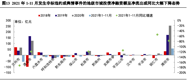 此外,前文關注到2021年河南省非標違約事件顯著增加,發生非標違約事件的地區主要為河南省平頂山市,且河南省焦作市也開始出現非標違約事件。究其原因,2020年11月河南省級國有企業永城煤電控股集團有限公司超短期融資券違約,“無序違約”引發市場震驚,永煤事件發生后至2021年1月下半旬河南省內均未有城投債發行,且2021年1-11月河南省城投債凈融資同比下滑38.21%,地區國有企業信用風險事件引發的連鎖反應導致區域內城投融資受阻,也增加了區域內城投信用風險事件發生的可能性。