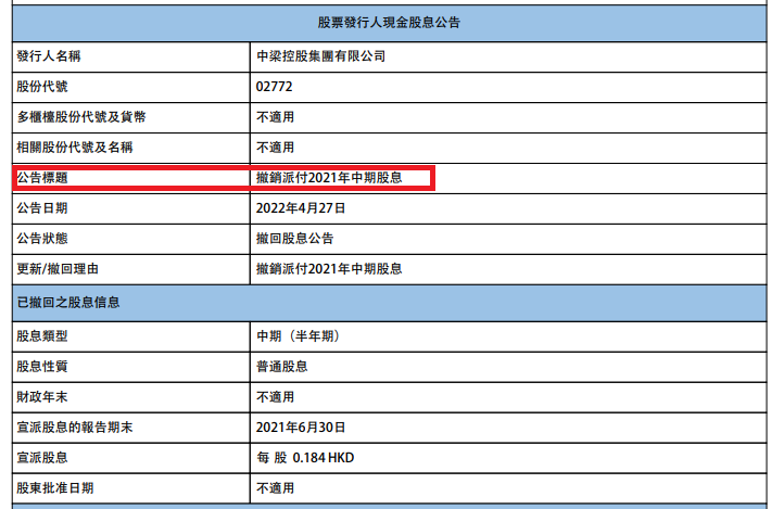 該司董事會已決議,撤銷派付于2021年8月24日宣派截至2021年6月30日止六個月的中期股息。