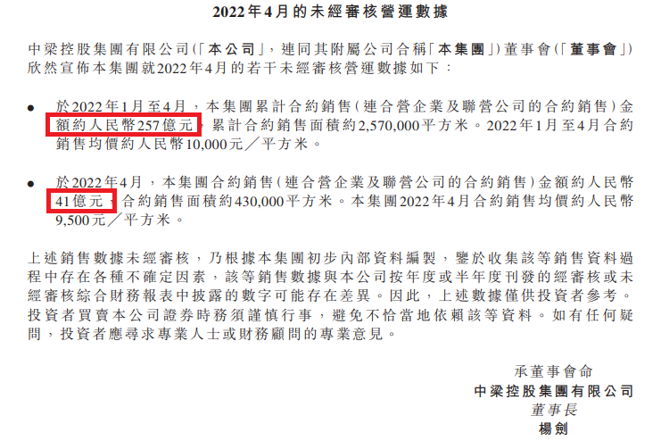 按照最新的數據披露,2022年4月,中梁控股合約銷售41億元,單價約9500元/平米。