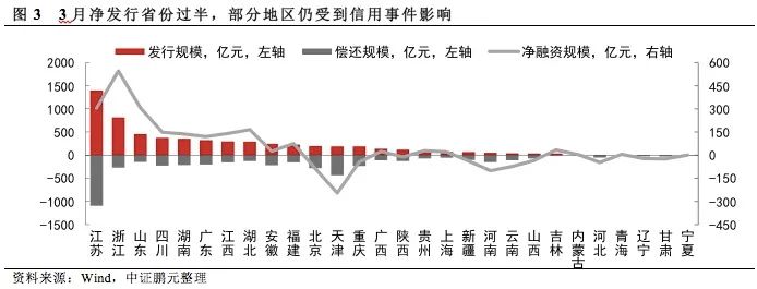 過半數(shù)省份實(shí)現(xiàn)城投債凈發(fā)行,天津、河南等地再融資較為困難:從各省份城投債凈融資情況來看,2021年3月份共有17個(gè)省份實(shí)現(xiàn)城投債凈發(fā)行。而天津和河南分別凈償還246億元和100億元。自2020年11月永煤違約以來,河南省城投債再融資持續(xù)受阻,至今仍處于信用修復(fù)期。部分債務(wù)率較高的省份發(fā)行城投債勢(shì)頭也相應(yīng)減弱,如云南省3月份僅發(fā)行38億元,凈償還規(guī)模73億元。