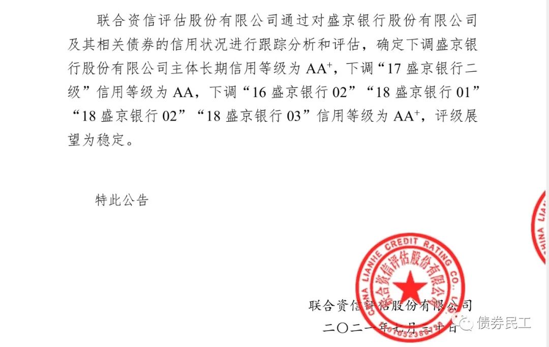 根據聯(lián)合資信2021年7月30日出具的跟蹤評級報告,盛京銀行股份有限公司(以下簡稱“盛京銀行”)的主體長期信用等級由AAA下調至AA+。根據公開披露的盛京銀行財務數(shù)據,截至2020年末,盛京銀行的資產總額為10379.58億元,是國內為數(shù)不多的資產破萬億的城商行。目前國內資產破萬億的城商行包括北京銀行、上海銀行、江蘇銀行、南京銀行、寧波銀行、徽商銀行、杭州銀行和盛京銀行。