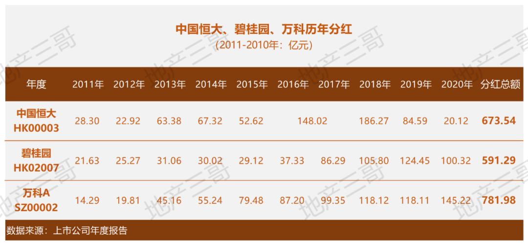 同期,碧桂園與萬(wàn)科的分紅:從2011年到2020年,碧桂園分紅591億元,萬(wàn)科分紅782億元。