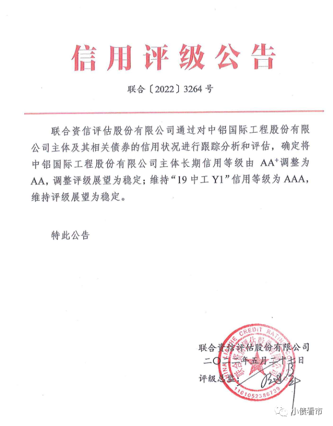 近日,聯合資信公告稱,將中鋁國際(02068.HK/601068.SH)長期債務評級從AA+下調至AA,調整評級展望為穩定,維持“19中工Y1”信用等級為AAA。