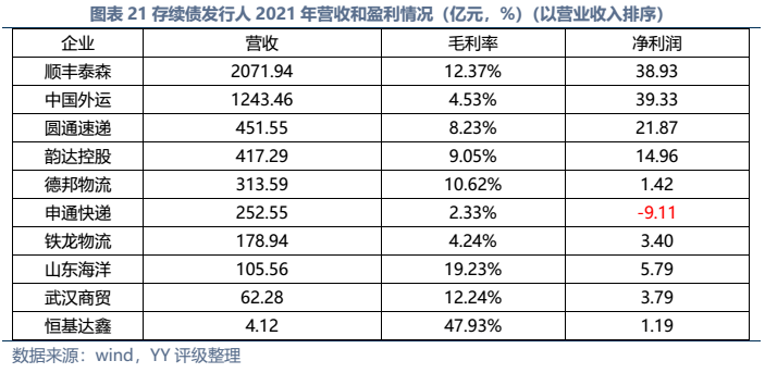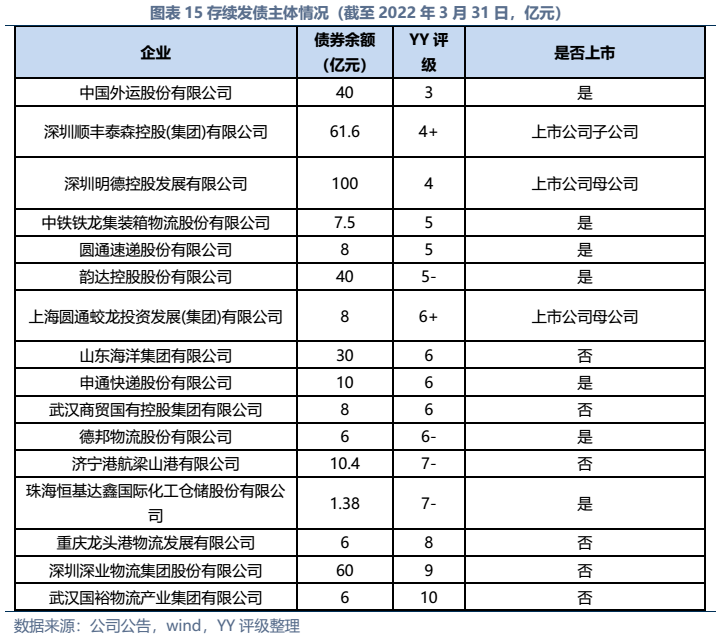 信用債市場方面,上市公司中高頻出現的“多式聯運”、“智慧物流”、“供應鏈管理”等概念在發債主體中熱度不高,主要仍以傳統物流企業為主。截至22年3月末,YY行業為物流的存續債主體共有16家,債券余額合計為402.88億元。行業整體毛利率不高(平均13%),杠桿率偏低(平均資產負債51.3%)。資質方面,貨代龍頭中國外運信用資質最好,中鐵鐵龍集裝箱背靠國鐵集團資源,信用資質也較好。快遞細分領域集中度較高,市場格局相對穩定,也有較強的經營獲現能力支撐,順豐、韻達、圓通信用資質尚可,申通快遞盈利較差,資質稍弱。濟寧港航梁山港、珠海恒基達鑫、重慶龍頭港等工業品物流企業信用資質較弱。