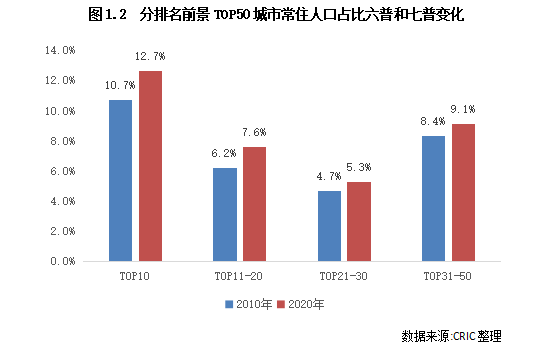 前景TOP50城市多為區域經濟發展重點城市,經濟發展水平領先于全國大部分城市,一直以來就是流動人口的主要流入地。而隨著經濟發展模式逐漸以區域經濟發展模式為主,這些城市對流動人口的吸引力也進一步增強。對比六普和七普TOP50城常住人口占比來看,2020年末前景TOP50城市匯集了全國35%的人口,較十年前上漲了4.6個百分點,漲幅較上一個十年也增加了近一個百分點。