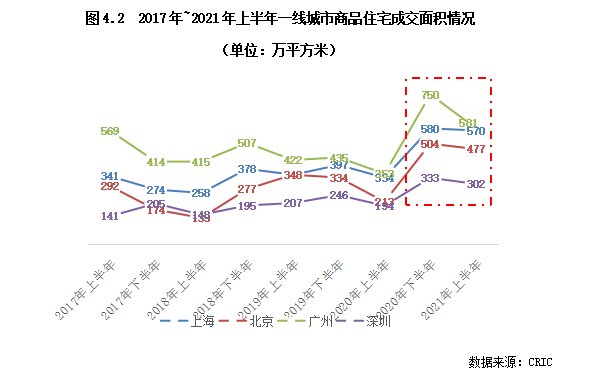 正是由于外來人口的持續流入,一線城市的購房需求支撐長期表現強勁,尤其是在2020年上半年疫情發生之后, 一線城市的樓市表現超出預期,韌性十足。具體來看,雖然在2020年上半年疫情的影響下四城的住宅成交量同比下滑,但2020年下半年樓市成交迅速反彈,北上廣深四個城市的商品住宅成交量均明顯走高,并達到2017年以來的最高點,其中上海、廣州和深圳的同比漲幅均在15%以上。進入2021年,四城的樓市成交熱度仍保持在高位;雖然上海、深圳、廣州等城市收緊了調控,但四城市2021年上半年的商品住宅成交規模較以往同期仍是上漲的,和2020年下半年相比也僅是小幅下跌。不僅成交量上行,一線城市的成交均價同樣也呈現出持續上揚的態勢;由此可見,一線城市的樓市韌性之足。