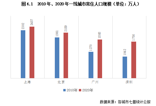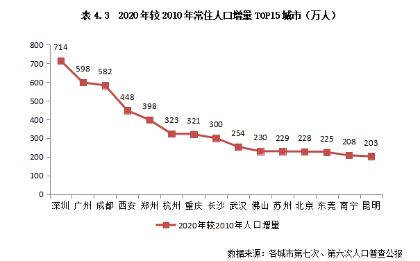 也正因為此,一線城市對流動人口的吸引力仍遠超出二三線城市。對比六普和七普常住人口數據可以發現,四個一線城市在十年間的常住人口增量均位于全國TOP20,包括落戶門檻最為嚴格的北京和上海。其中,深圳和廣州更是分別以714萬和598萬的增量分列全國第一二位,成為主要城市中人口增量最多的城市。