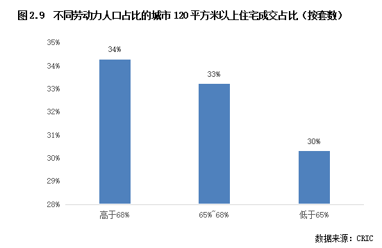 結合年齡結構來看,雖然不同城市之間基本面差異較大,但勞動力占比越高的城市,中大面積段的產品市場份額也相對更高,如勞動力占比高于68%的城市,120平方米以上的產品成交份額平均約34%,比勞動力占比低于65%的城市平均高出了4個百分點。