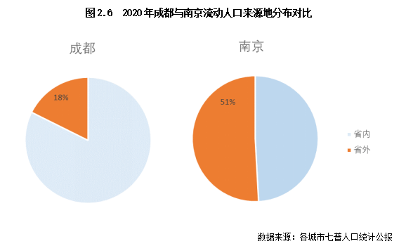 不過,相對于南京、廈門等東部沿海城市,成都、西安等城市對省內人口的吸引力較強,對省外人口的吸引力相對偏弱。如在成都的流動人口構成中,82%來自四川省省內,省外流動人口的占比不足兩成,而南京流動人口中則有一半以上來自省外,比例明顯高于成都。由此來看,成都等城市對外省人才的吸引力有待進一步提升。