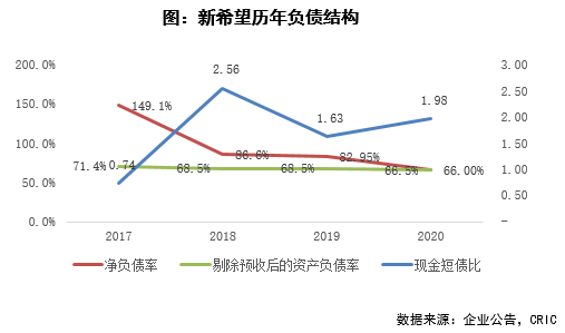 2020年新希望地產持續保證較高的回款率,銷售回款率達到90%,得益于此,2020年末,新希望地產持有現金150.91億元,同比上升14.2%,現金短債比1.98,短期內償債壓力較小;長短債比3.78,同比增長0.5,債務結構健康。