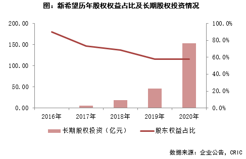 另一方面,銷售的增長還得益于新希望地產自2018年以來在拿地方面比較積極,且持續加大與其他房企的合作。2020年新希望地產新增土地總價的73%都在二線城市,在蘇州、南京、杭州等城市積極補充土儲。與此同時,新希望地產的合作力度持續較大,與萬科、融創、保利、融信等大型房企,建立了長期的合作關系,可以通過多元合作拿地從而實現風險分散,同時學習這些大型房企的產品打造及運營管理經驗,2020年新希望銷售金額權益比為52%。同時可以看到,2020年新希望的長期股權投資152.92億元,同比增長233.0%,四年復合增長率達到191%,通過合作開發,在降低拿地風險的同時,也促進新希望地產銷售規模實現較大的飛躍。